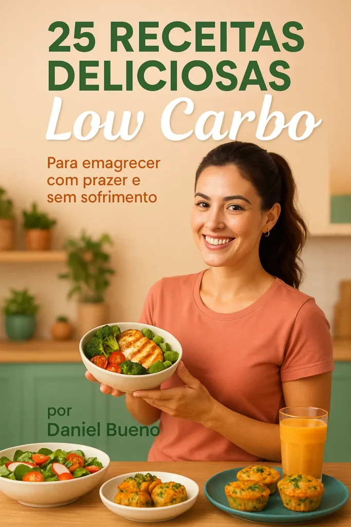 Este eBook traz 25 receitas low carb práticas, saborosas e fáceis de preparar para quem busca emagrecer com prazer, sem abrir mão do sabor.